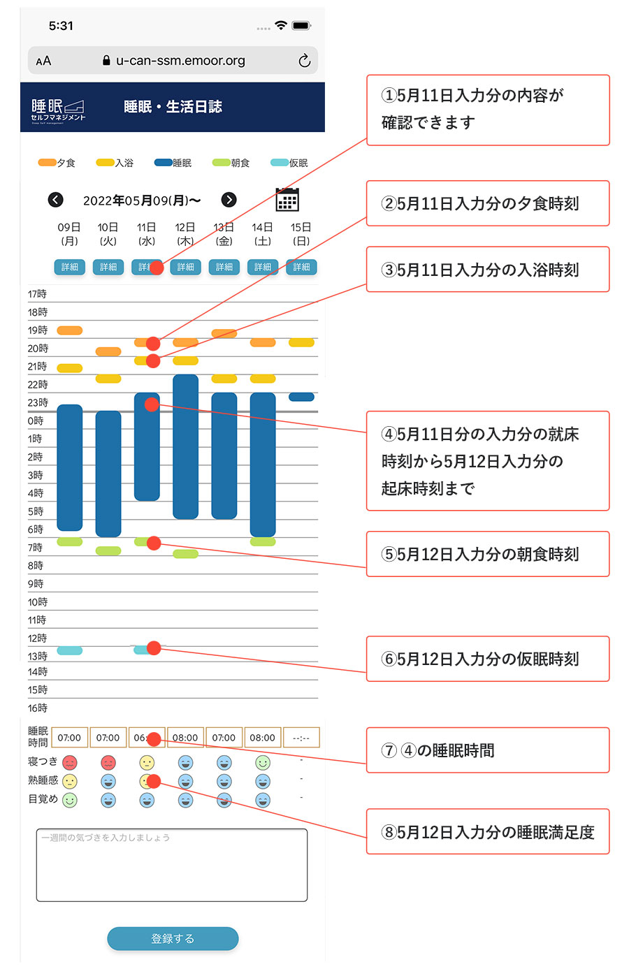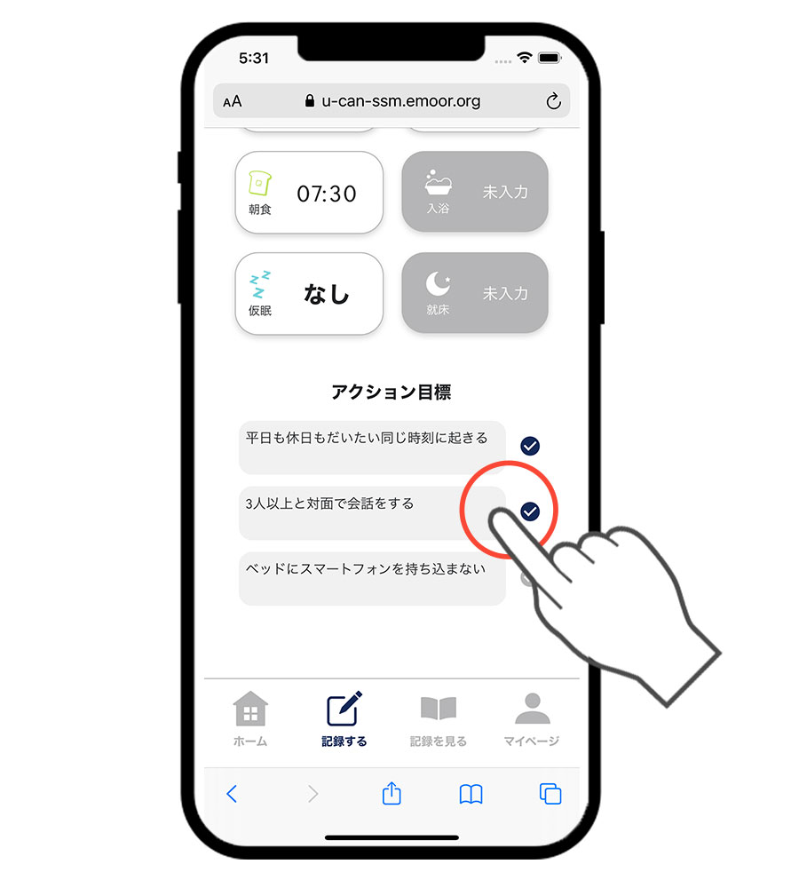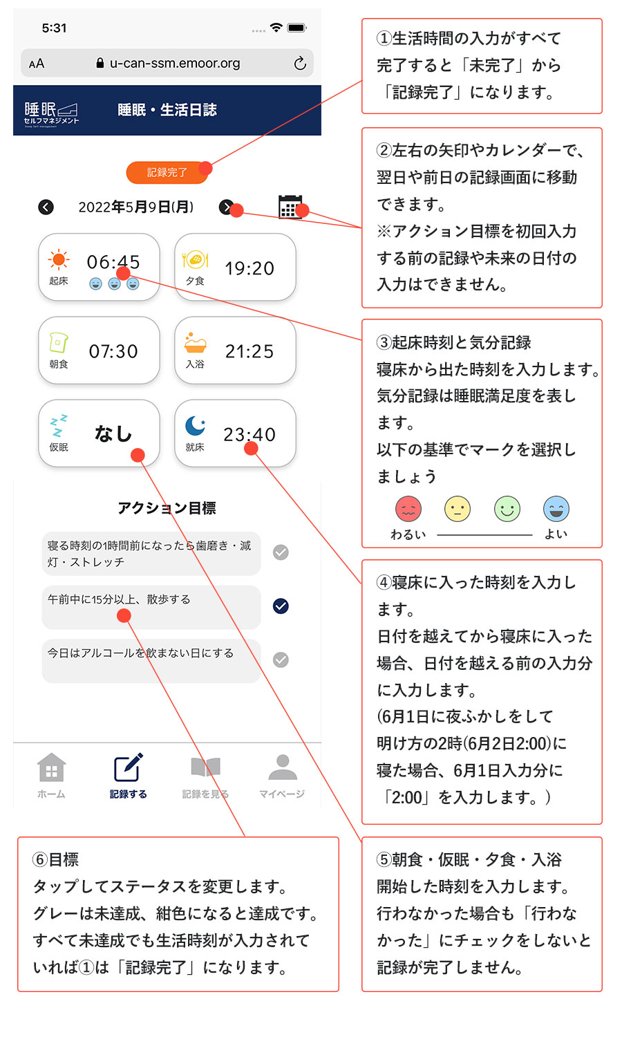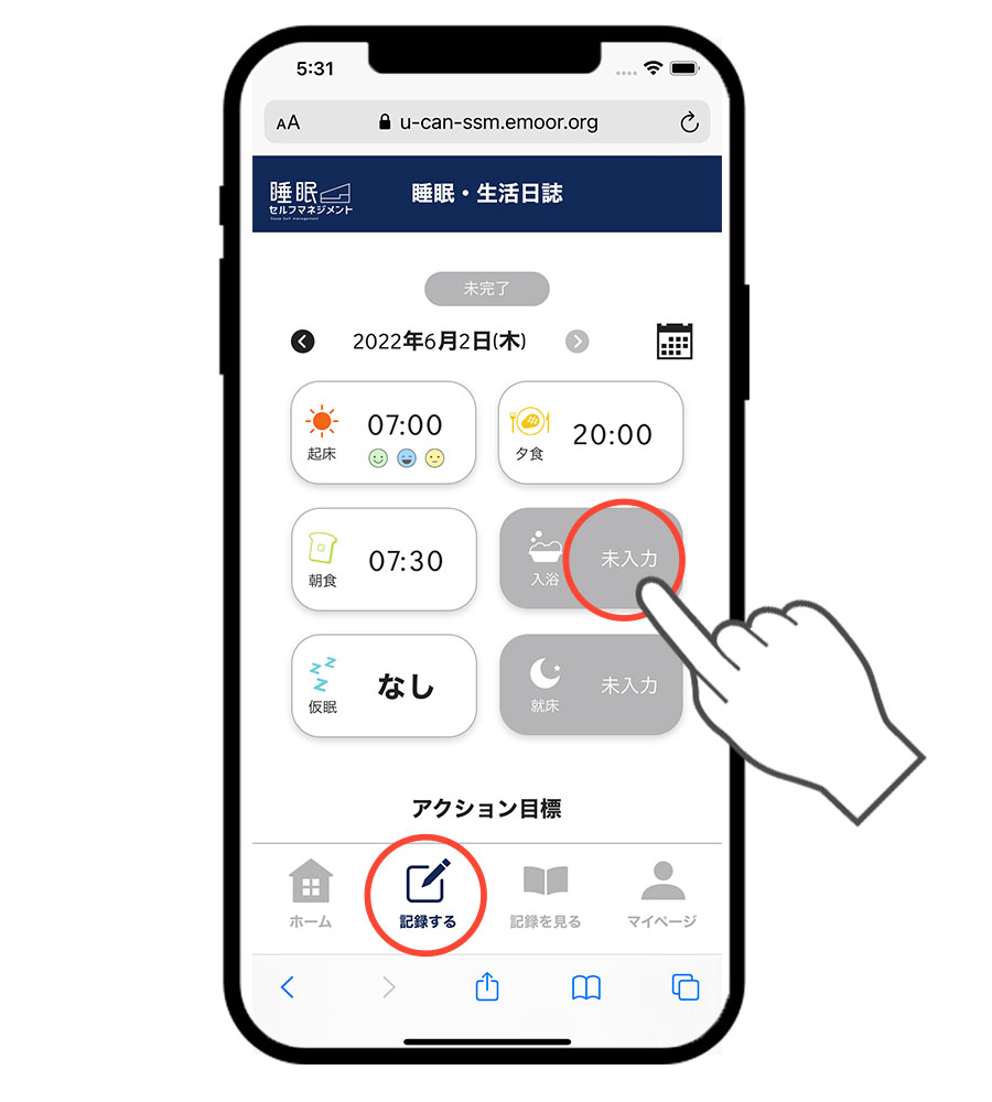 「記録する」タブから、睡眠・生活日誌の記録をしましょう。各ボタンをタップすると行動時刻が入力できます。