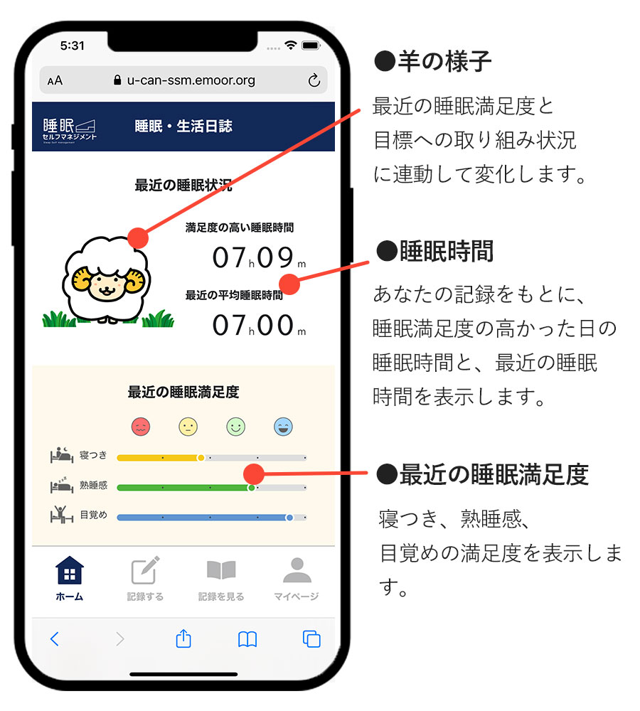 「ホーム」タブから、ホーム画面を確認しましょう。あなたの最近の睡眠に関するデータが、簡単に確認できます。