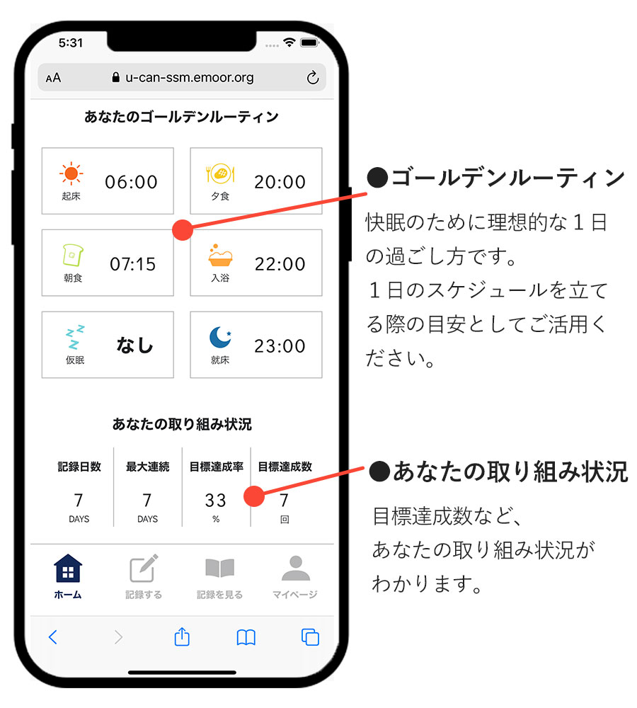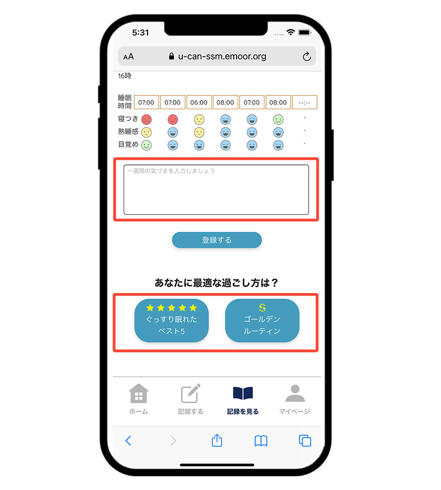 気づきがあればメモしておきましょう。また、記録がたまると「ぐっすり眠れた日ベスト5」や「ゴールデンルーティン」が確認できるようになります。