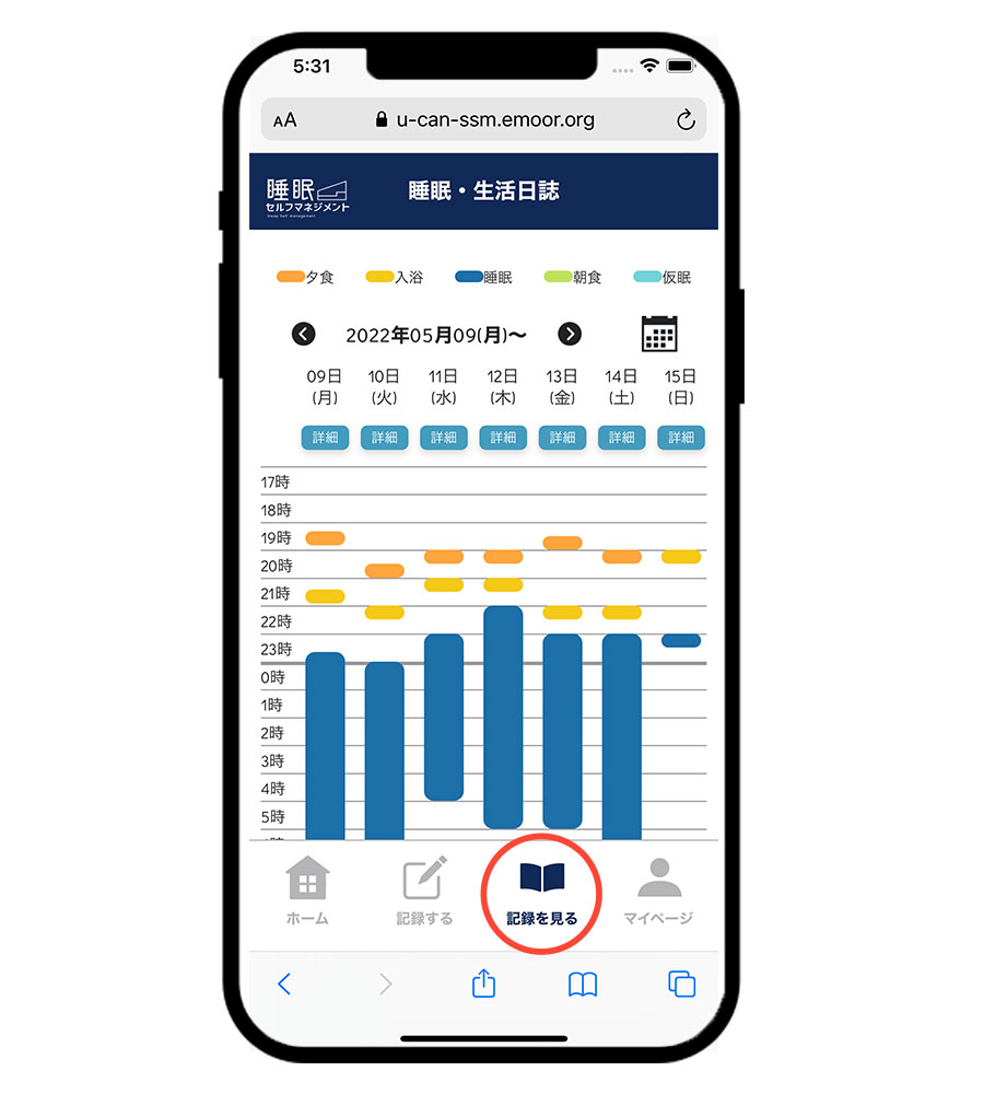 「記録を見る」タブから、日々の記録内容を週単位のグラフで確認できます。