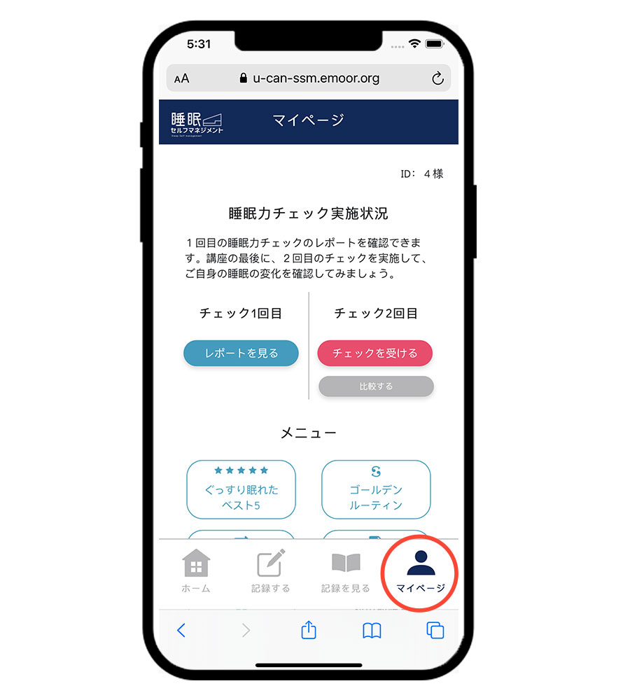 「マイページ」タブでは、睡眠力チェックのレポート確認や2回目の実施、その他、設定などが確認できます。
